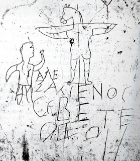 A mais antiga imagem pictórica do cristianismo é um ato de blasfêmia. Trata-se do grafite de Alexamenos, encontrado durante escavações no Monte Palatino, em Roma, no ano de 1875. Calcula-se que o grafite seja do século III da era cristã. O desenho em gesso mostra a crucificação de um burro, tendo a seus pés um fiel em atitude de adoração. A legenda, em grego, diz: “Alexamenos adora seu deus”. Imagine-se que Alexamenos seja um cristão dos primeiros tempos, ridicularizado por seus colegas.
